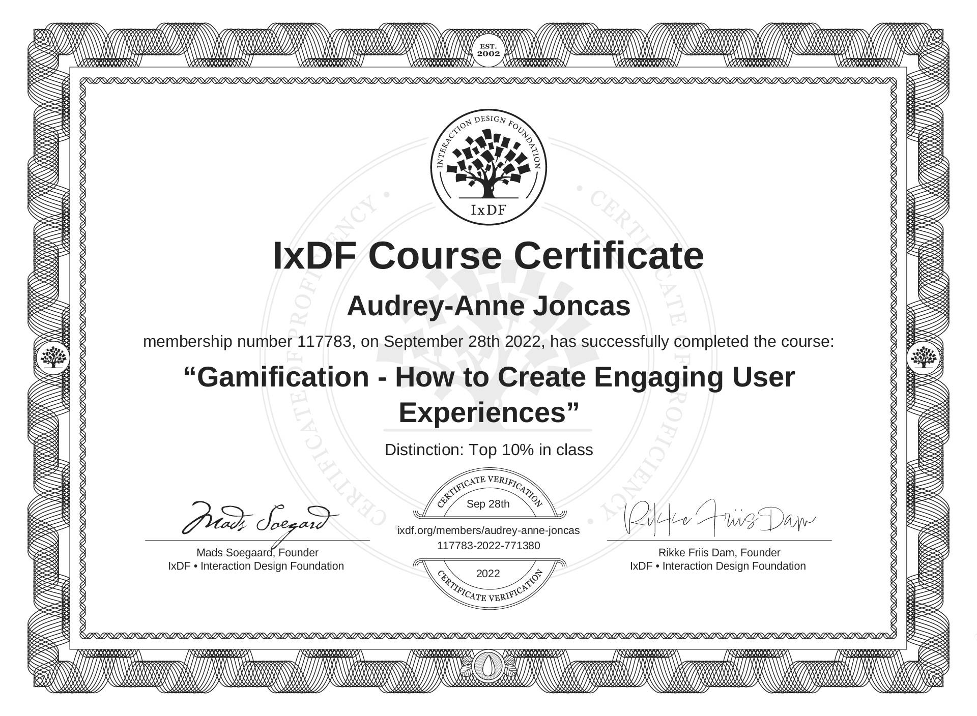 Audrey-Anne Joncas's IxDF Course Certificate: Gamification - How to Create Engaging User Experiences