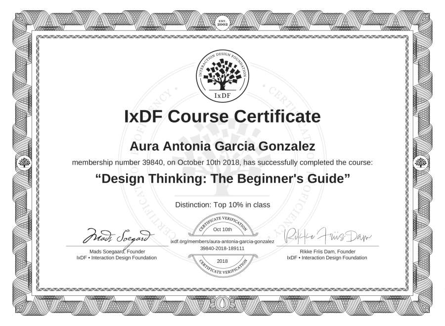 The IxDF Course Certificate above is awarded to Aura Antonia García González with a Top 10% Distinction in formal recognition of their coursework surpassing the rigorous benchmarks of exceptional performance established by the IxDF Educational Codex.