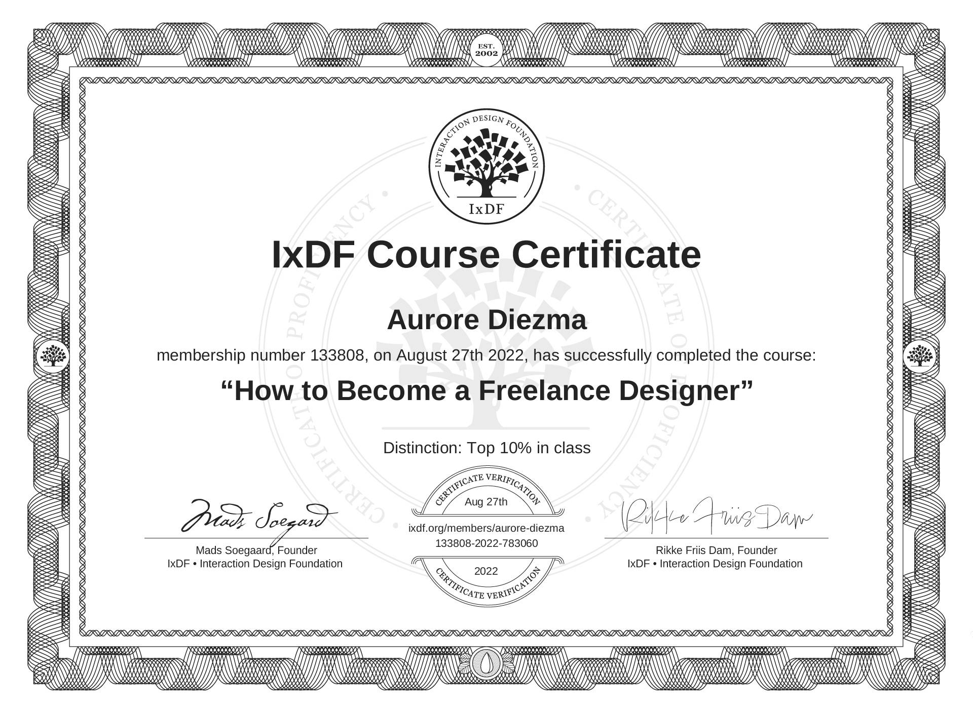Aurore Diezma's IxDF Course Certificate: How to Become a Freelance Designer
