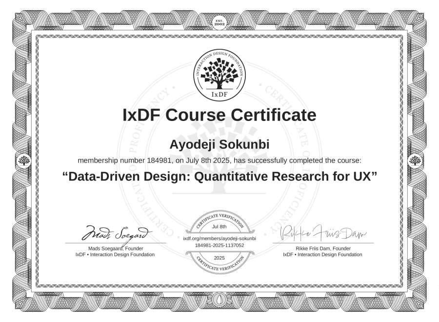 Ayodeji Sokunbi's IxDF Course Certificate: Data-Driven Design: Quantitative Research for UX