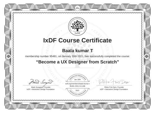 This IxDF Membership Certificate is issued to Baala kumar T in formal recognition of their membership of the IxDF, global leader in design education.