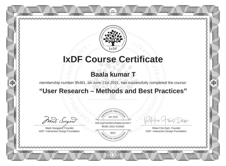 Baala kumar T's IxDF Course Certificate: User Research – Methods and Best Practices
