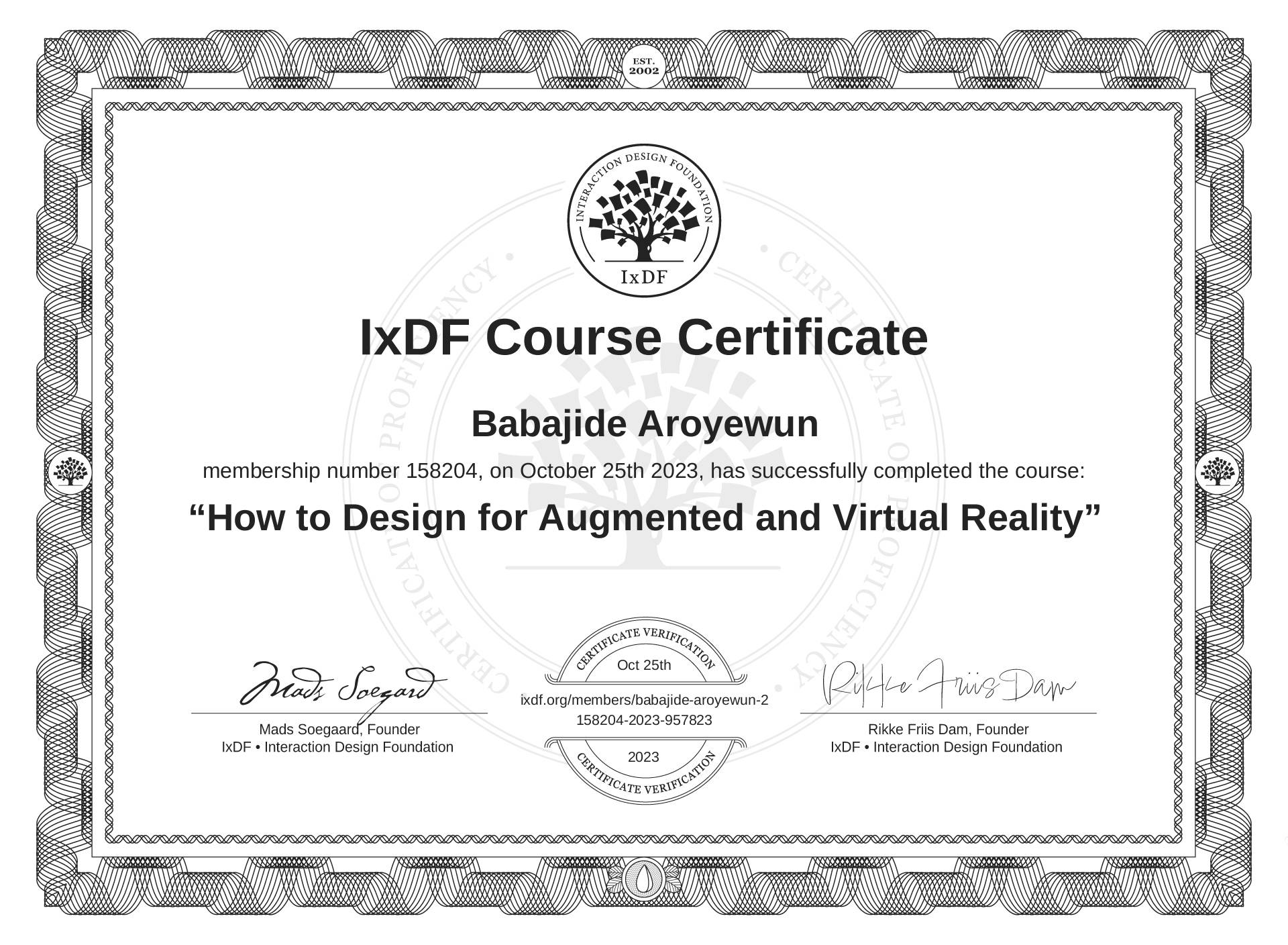 Babajide Aroyewun's IxDF Course Certificate: How to Design for Augmented and Virtual Reality