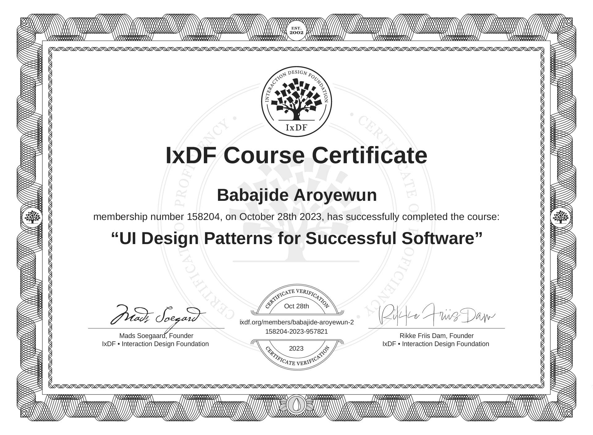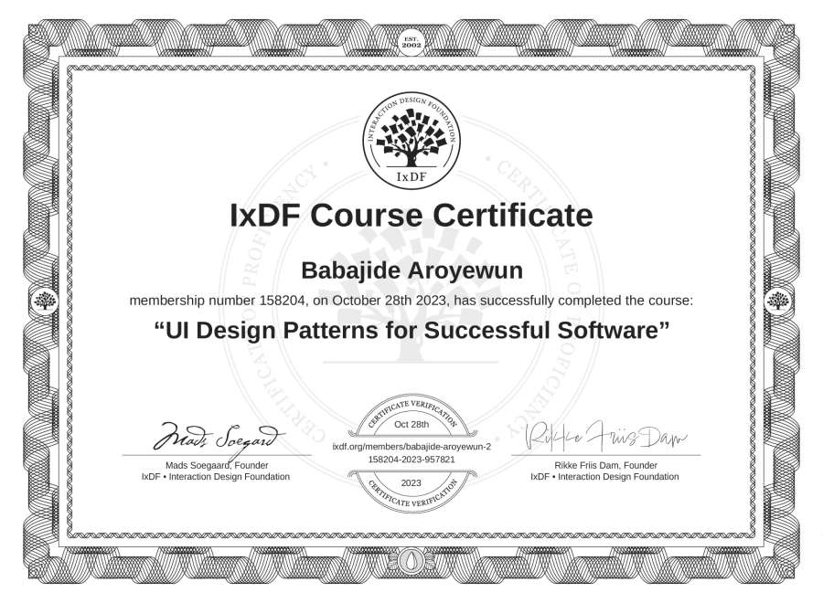 Babajide Aroyewun's IxDF Course Certificate: UI Design Patterns for Successful Software