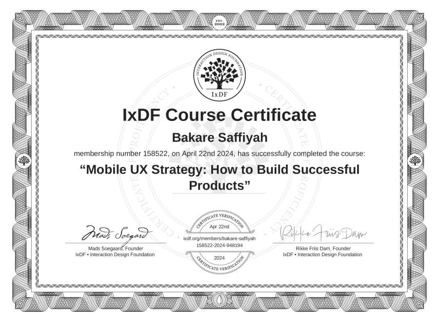 Bakare Saffiyah's IxDF Course Certificate: Mobile UX Strategy: How to Build Successful Products