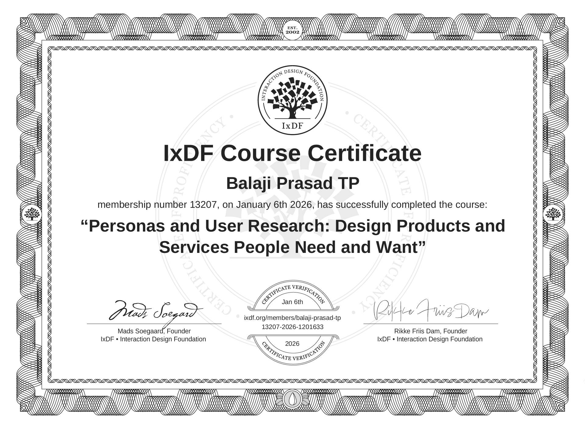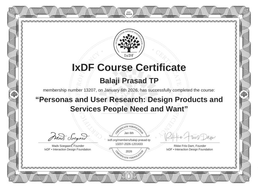 Balaji Prasad TP's IxDF Course Certificate: Personas and User Research: Design Products and Services People Need and Want