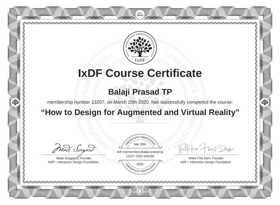 Balaji Prasad TP's IxDF Course Certificate: How to Design for Augmented and Virtual Reality