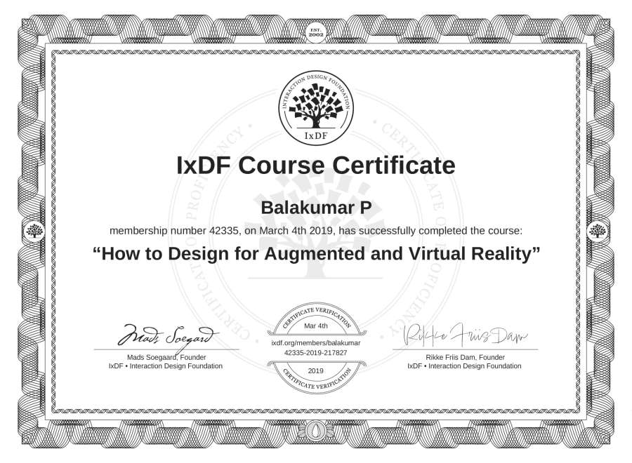 Balakumar P's IxDF Course Certificate: How to Design for Augmented and Virtual Reality