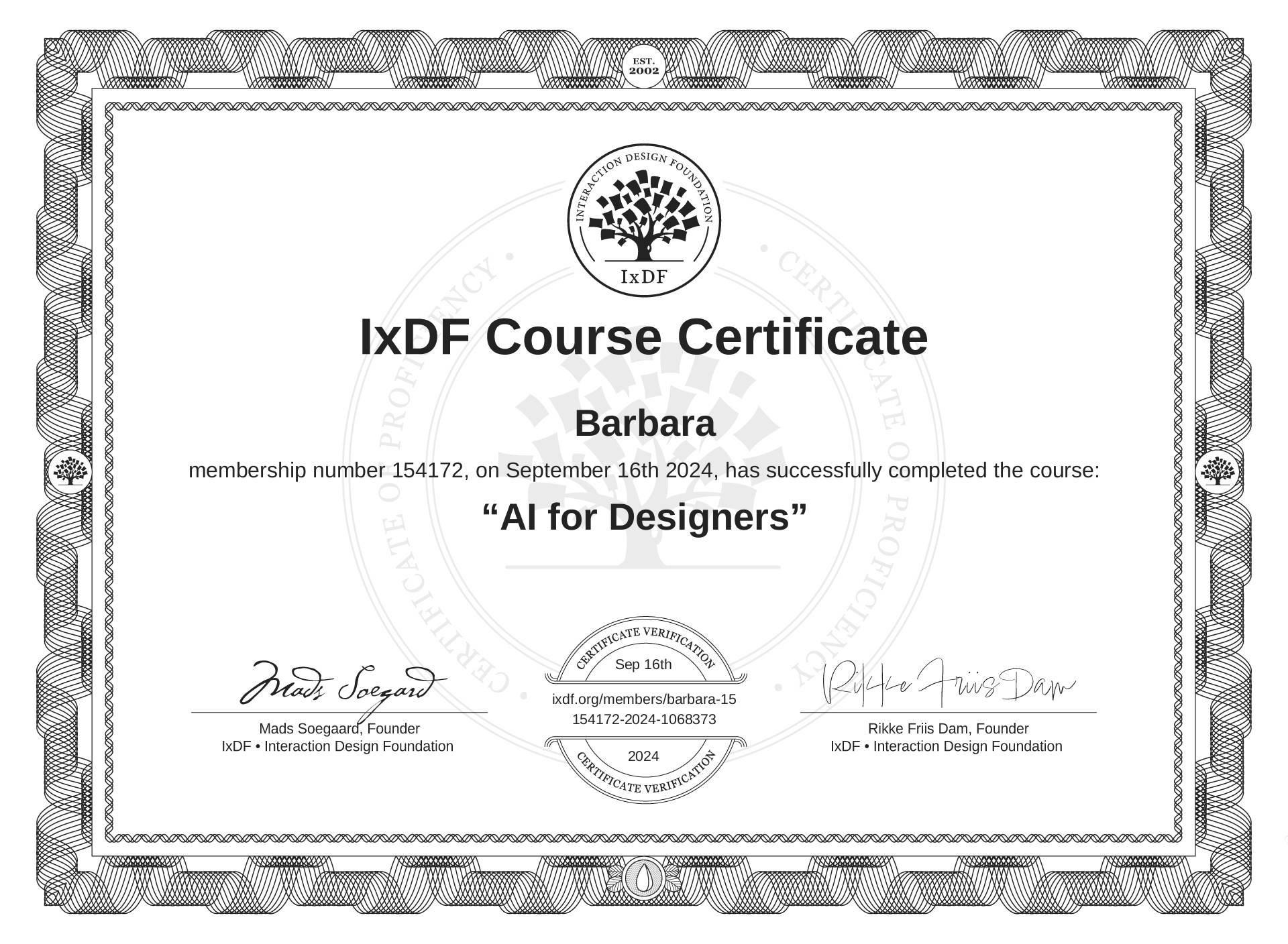 The IxDF Course Certificate above is awarded to Barbara in formal recognition of their coursework surpassing the rigorous benchmarks of exceptional performance established by the IxDF Educational Codex.