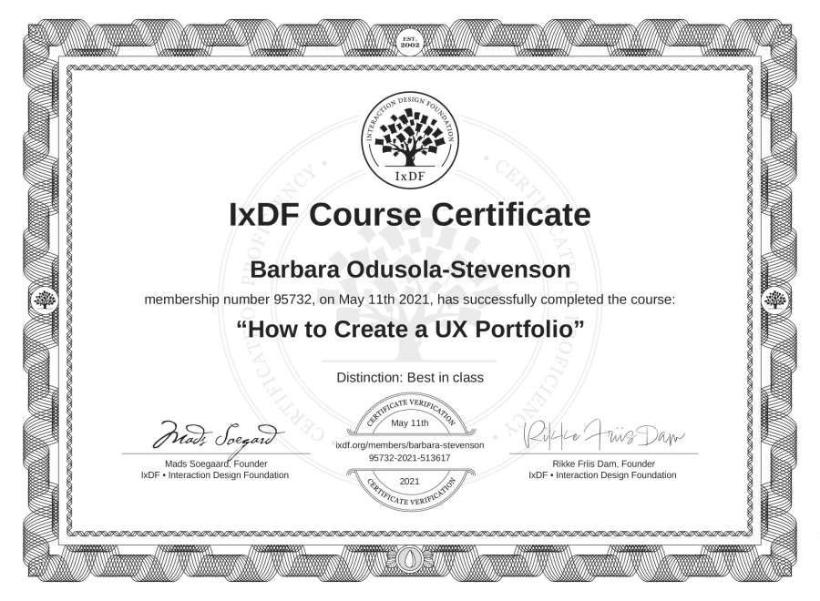 Barbara Odusola-Stevenson's IxDF Course Certificate: How to Create a UX Portfolio