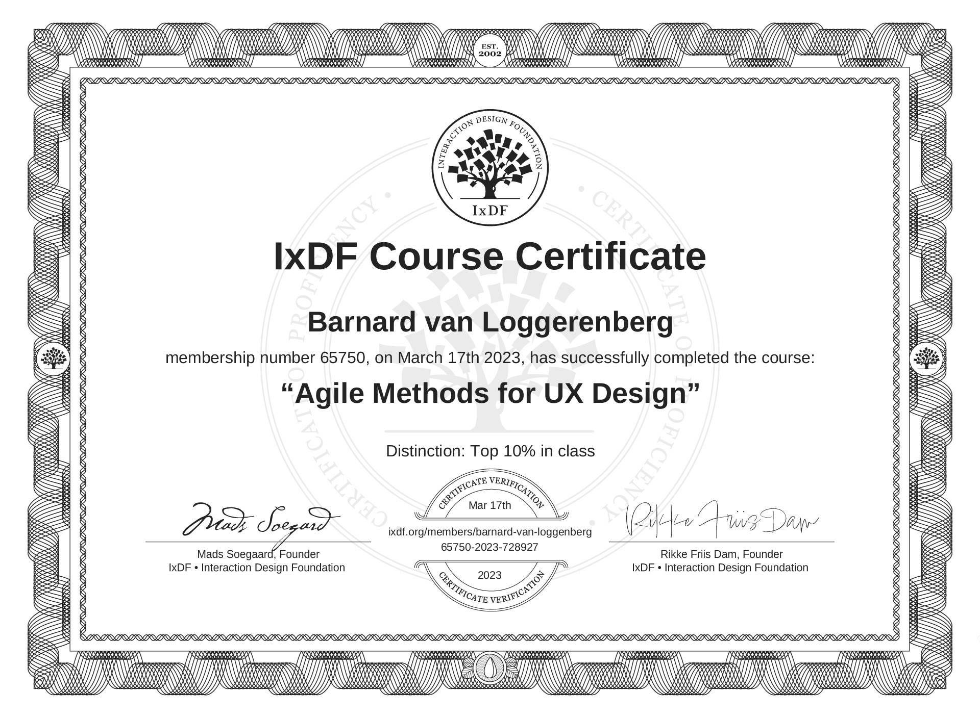Barnard van Loggerenberg's IxDF Course Certificate: Agile Methods for UX Design