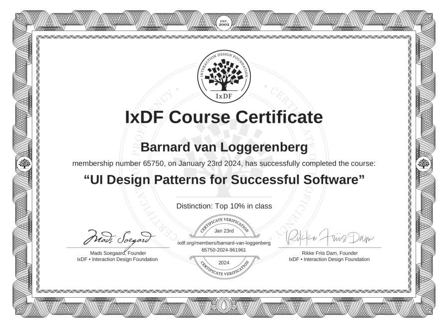 Barnard van Loggerenberg's IxDF Course Certificate: UI Design Patterns for Successful Software
