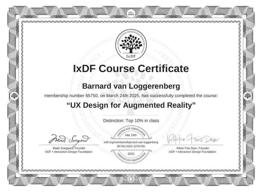 Barnard van Loggerenberg's IxDF Course Certificate: UX Design for Augmented Reality