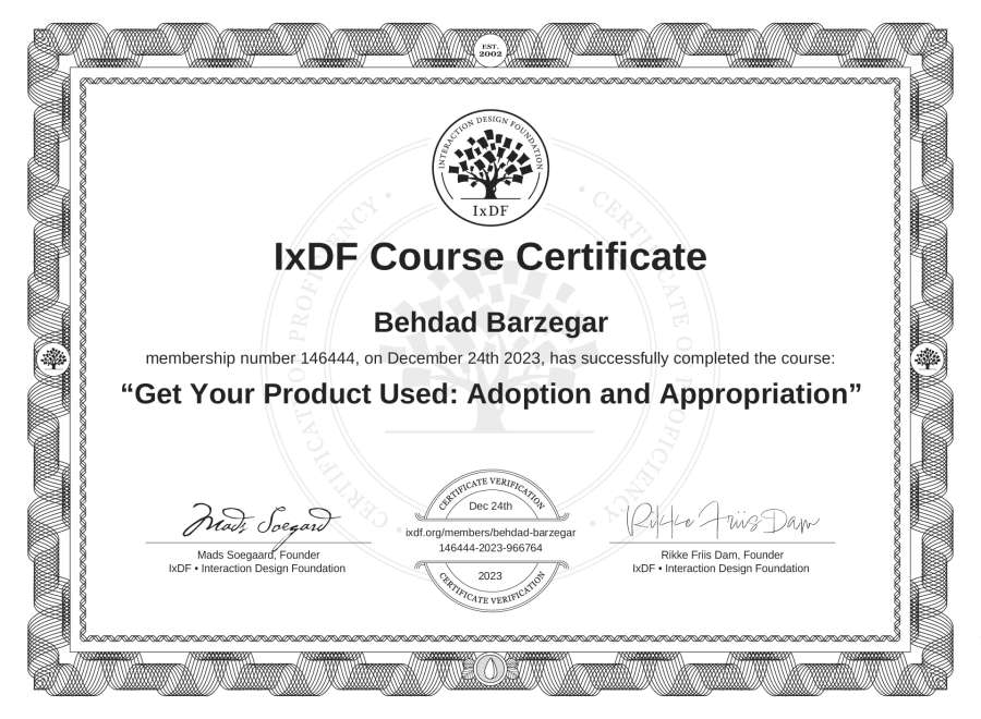 Behdad Barzegar's IxDF Course Certificate: Get Your Product Used: Adoption and Appropriation