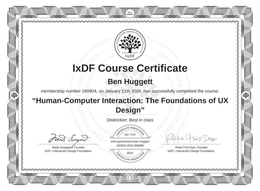 Ben Huggett's IxDF Course Certificate: Human-Computer Interaction: The Foundations of UX Design