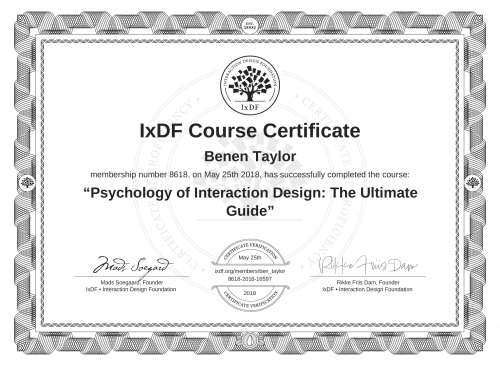 IxDF Course Certificates are awarded to Benen Taylor in formal recognition of their coursework surpassing the rigorous benchmarks of exceptional performance established by the IxDF Educational Codex.