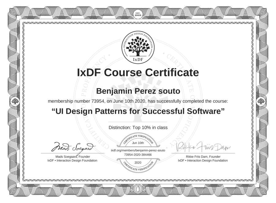 Benjamin Perez souto's IxDF Course Certificate: UI Design Patterns for Successful Software