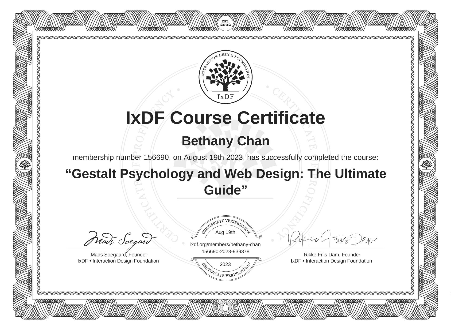 The IxDF Course Certificate above is awarded to Bethany Chan in formal recognition of their coursework surpassing the rigorous benchmarks of exceptional performance established by the IxDF Educational Codex.