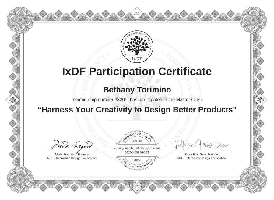 Bethany Torimino's IxDF Masterclass Certificate: Harness Your Creativity to Design Better Products