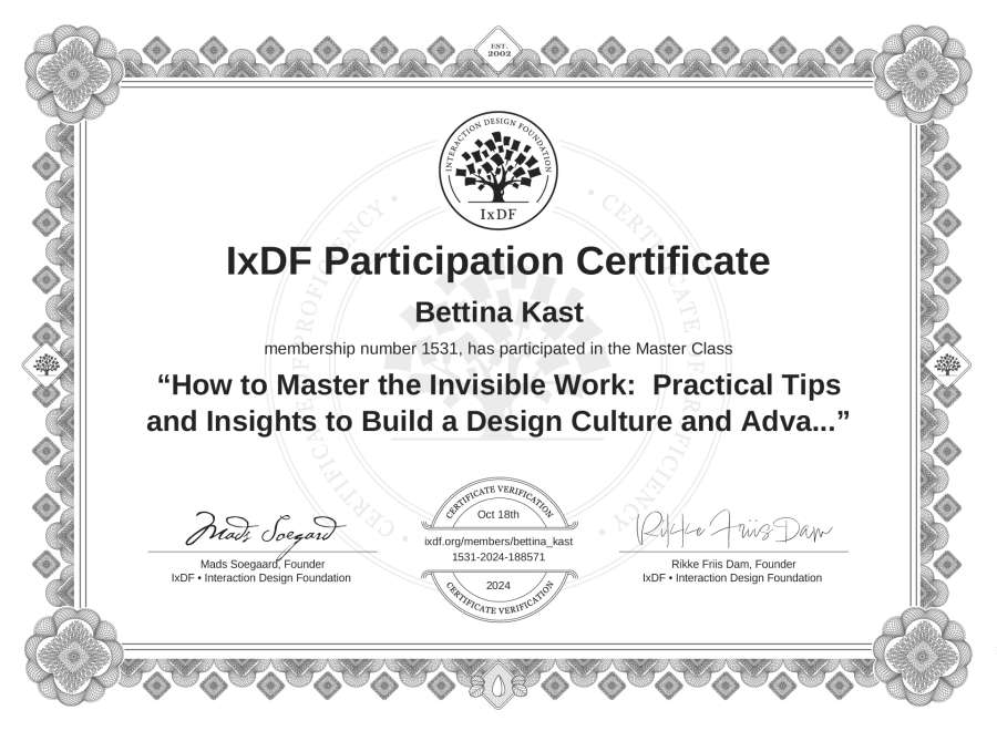Bettina Kast's IxDF Masterclass Certificate: How to Master the Invisible Work: Practical Tips and Insights to Build a Design Culture and Advance Your Career