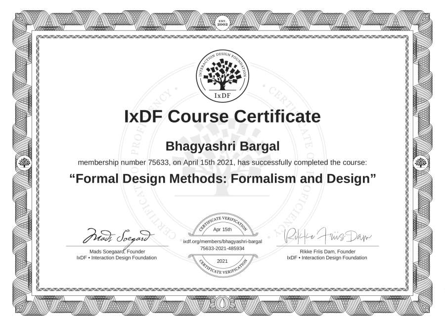 Bhagyashri Bargal's IxDF Course Certificate: Formal Design Methods: Formalism and Design