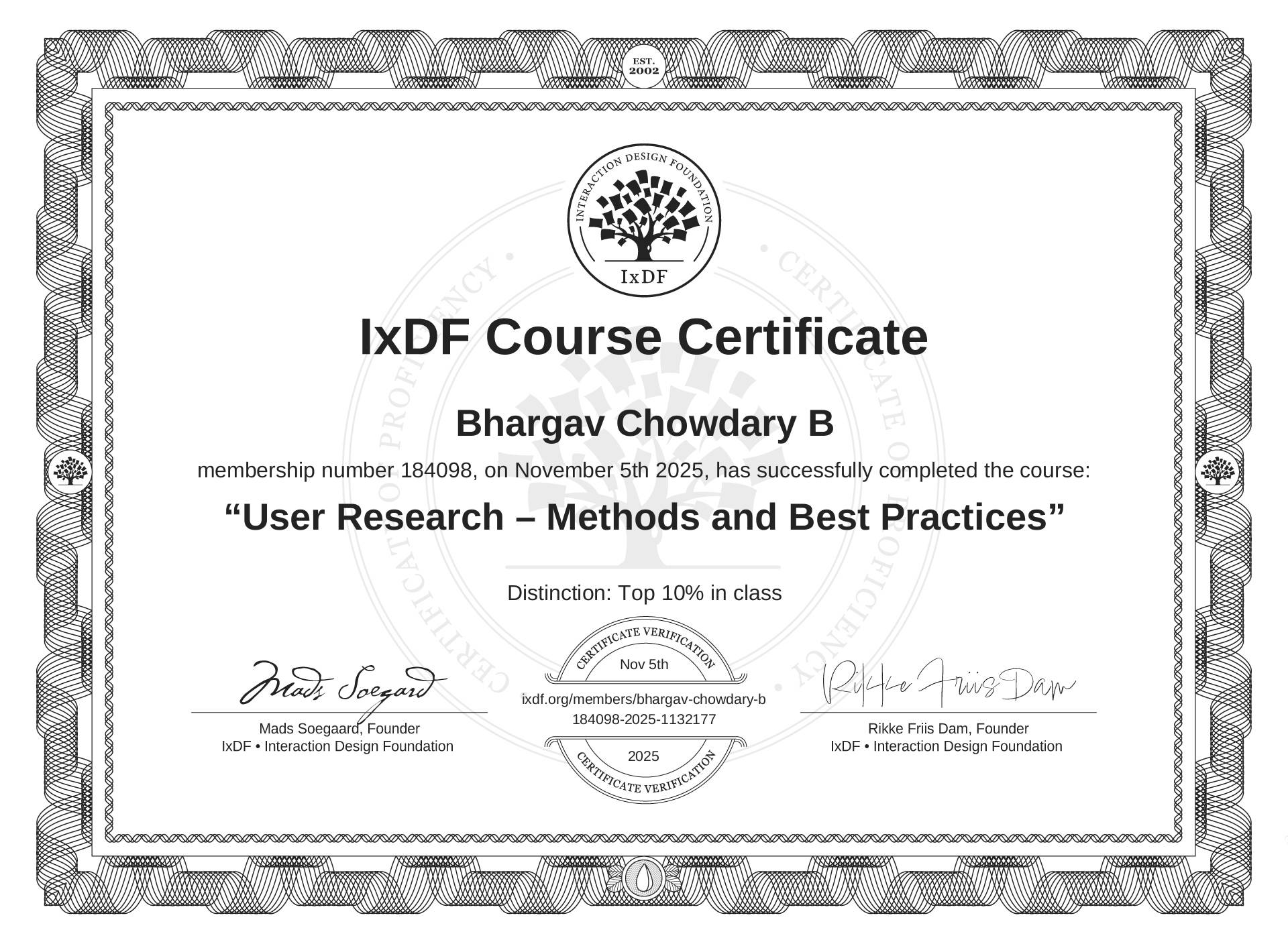 The IxDF Course Certificate above is awarded to Bhargav Chowdary B with a Top 10% Distinction in formal recognition of their coursework surpassing the rigorous benchmarks of exceptional performance established by the IxDF Educational Codex.