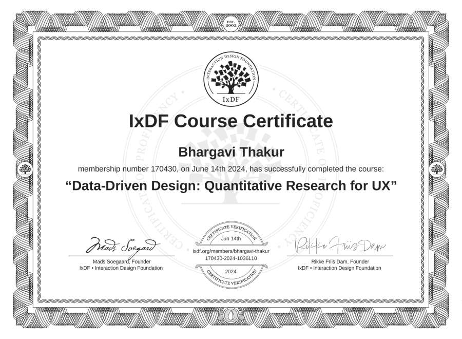 Bhargavi Thakur's IxDF Course Certificate: Data-Driven Design: Quantitative Research for UX