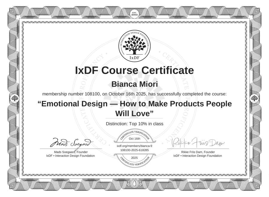 Bianca Miori's IxDF Course Certificate: Emotional Design — How to Make Products People Will Love