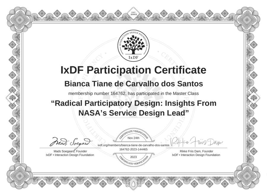 Bianca Tiane de Carvalho dos Santos's IxDF Masterclass Certificate: Radical Participatory Design: Insights From NASA’s Service Design Lead