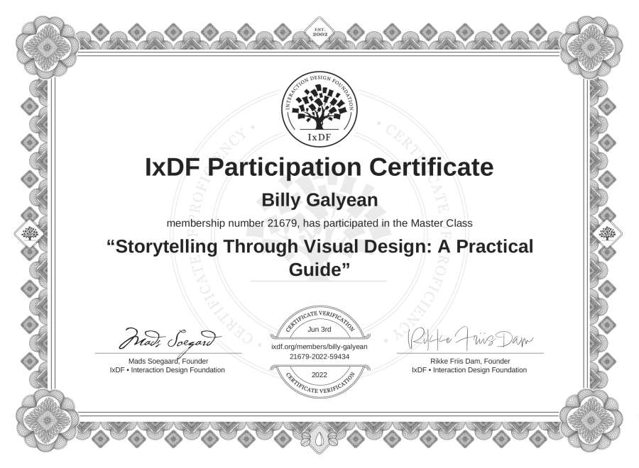 Billy Galyean's IxDF Masterclass Certificate: Storytelling Through Visual Design: A Practical Guide