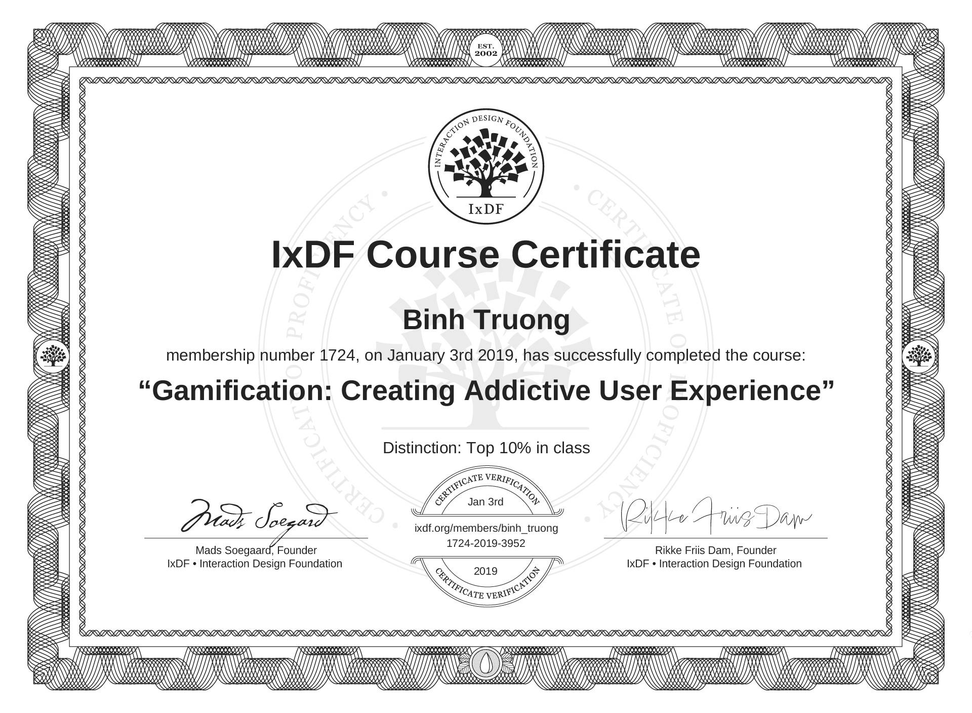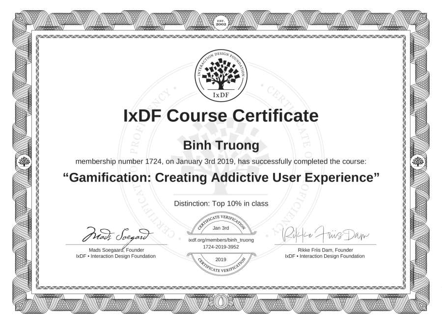Binh Truong's IxDF Course Certificate: Gamification: Creating Addictive User Experience