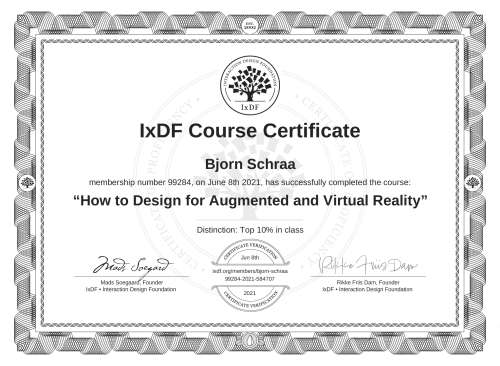 This IxDF Membership Certificate is issued to Bjorn Schraa in formal recognition of their membership of the IxDF, global leader in design education.
