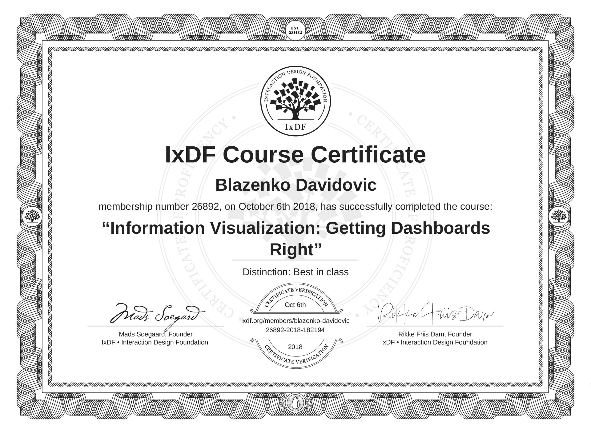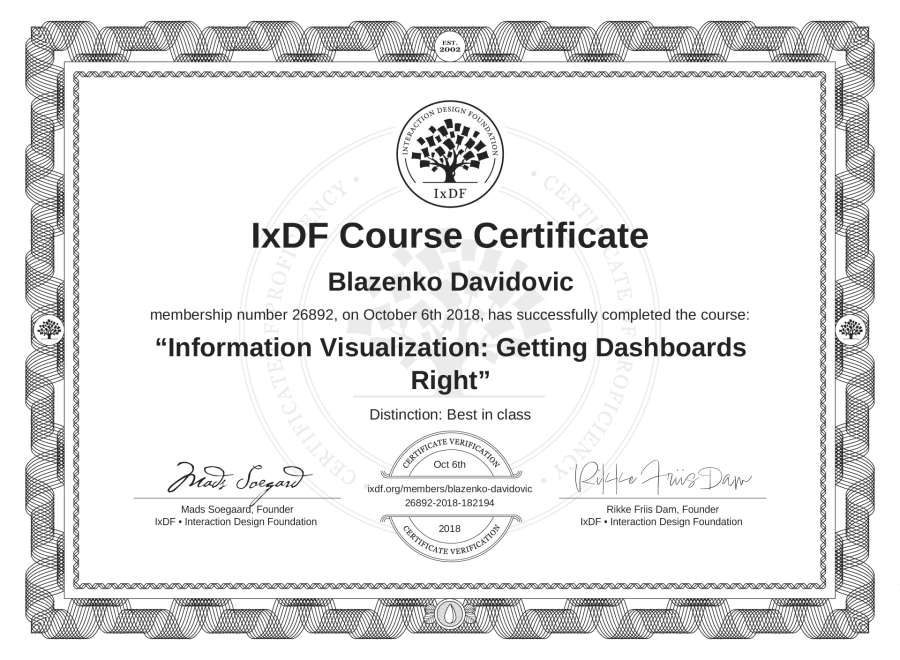 Blazenko Davidovic's IxDF Course Certificate: Information Visualization: Getting Dashboards Right
