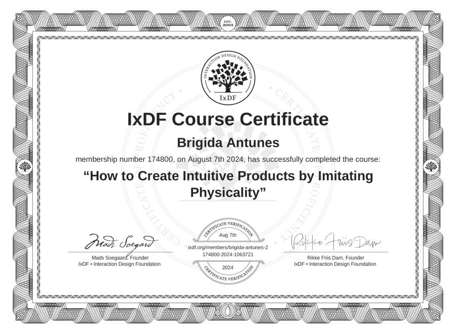 Brigida Antunes's IxDF Course Certificate: How to Create Intuitive Products by Imitating Physicality