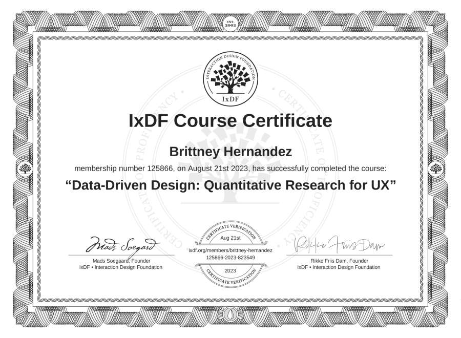 Brittney Hernandez's IxDF Course Certificate: Data-Driven Design: Quantitative Research for UX