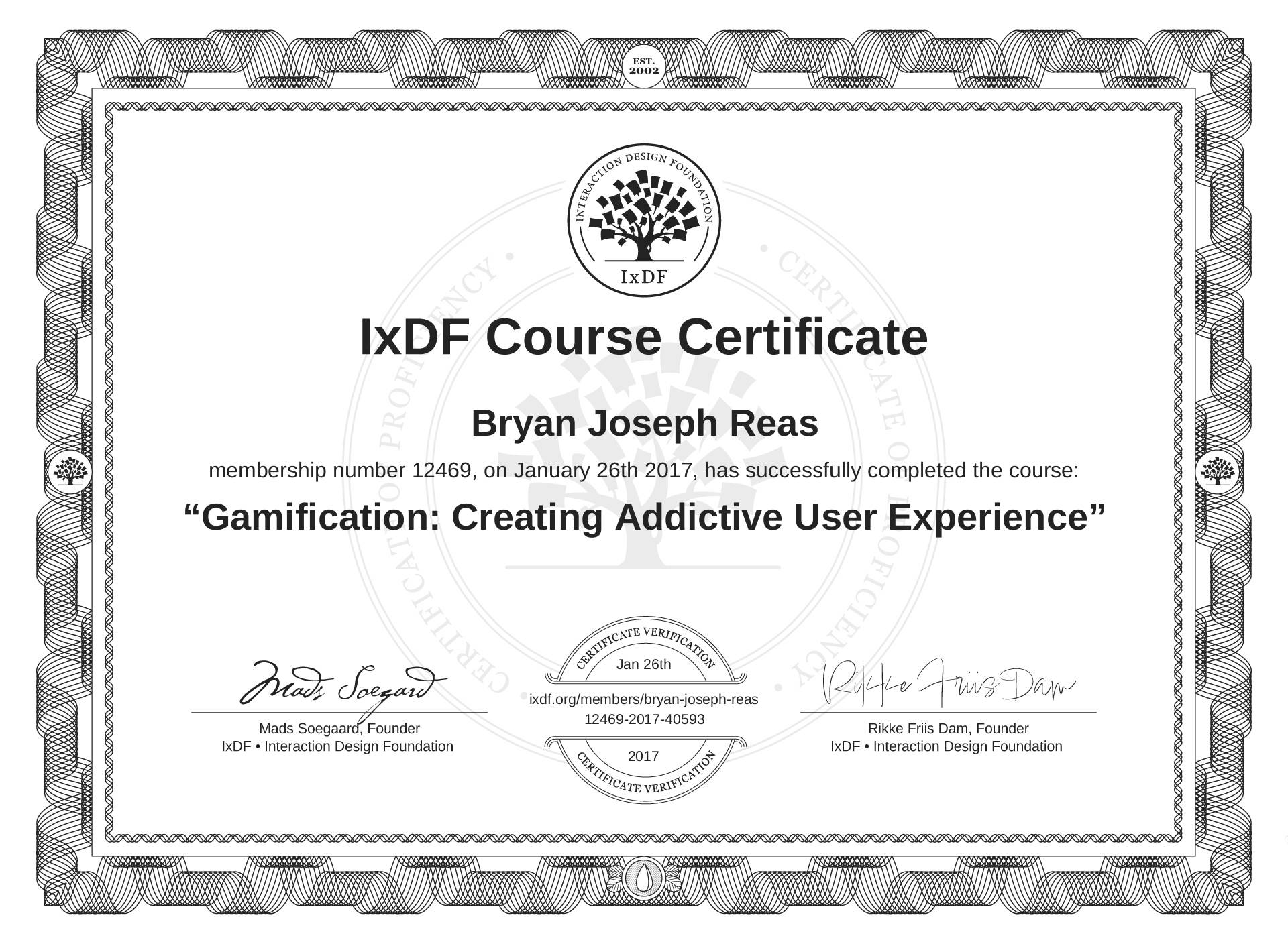 Bryan Joseph Reas's IxDF Course Certificate: Gamification: Creating Addictive User Experience