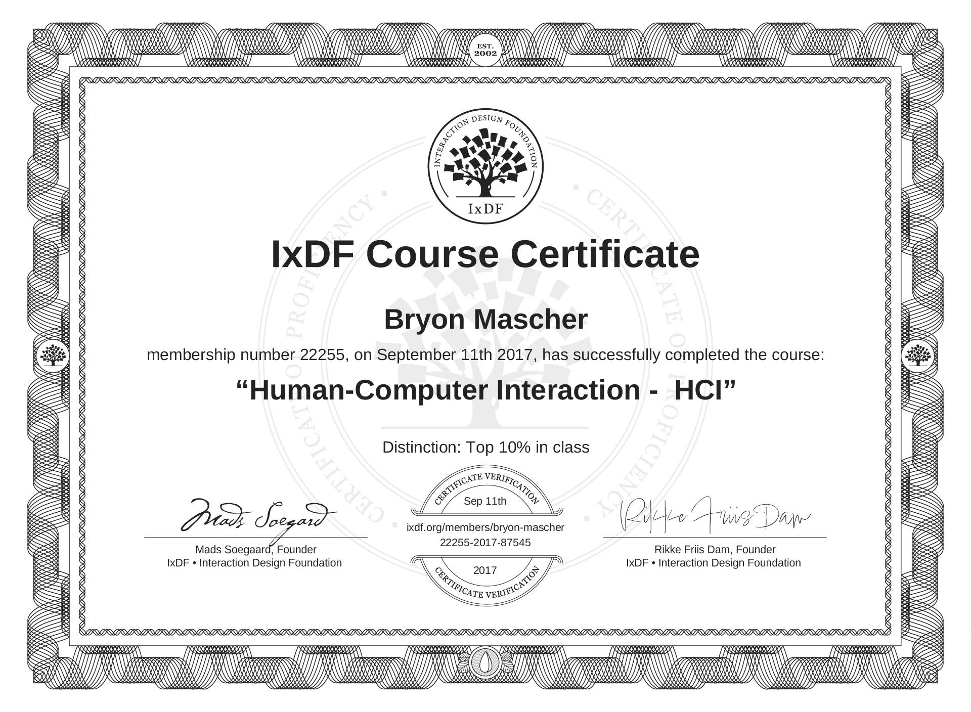 The IxDF Course Certificate above is awarded to Bryon Mascher with a Top 10% Distinction in formal recognition of their coursework surpassing the rigorous benchmarks of exceptional performance established by the IxDF Educational Codex.