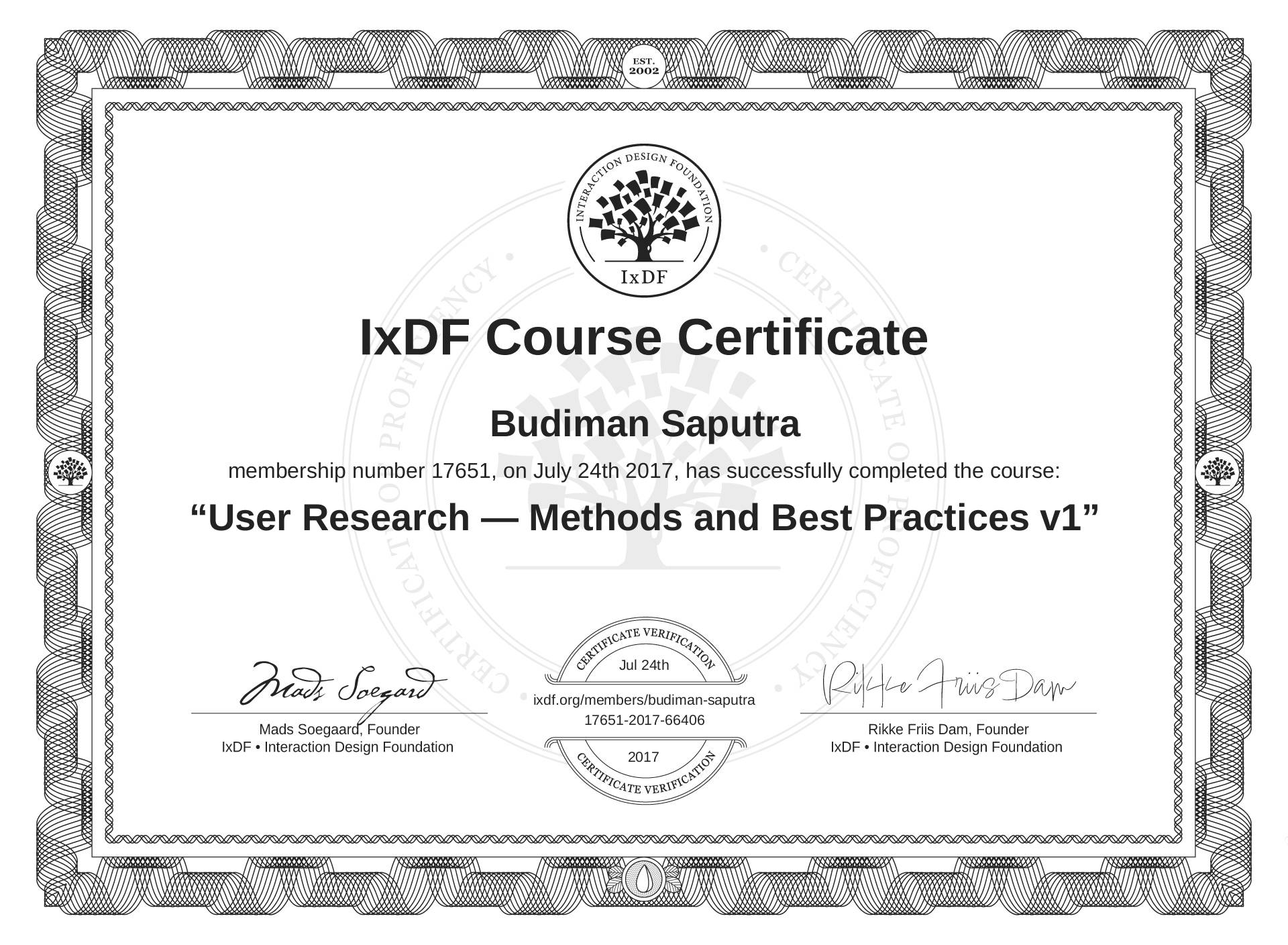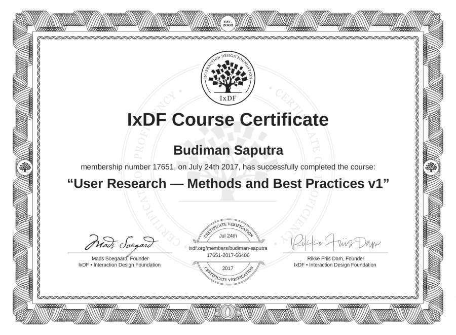 Budiman Saputra's IxDF Course Certificate: User Research — Methods and Best Practices v1