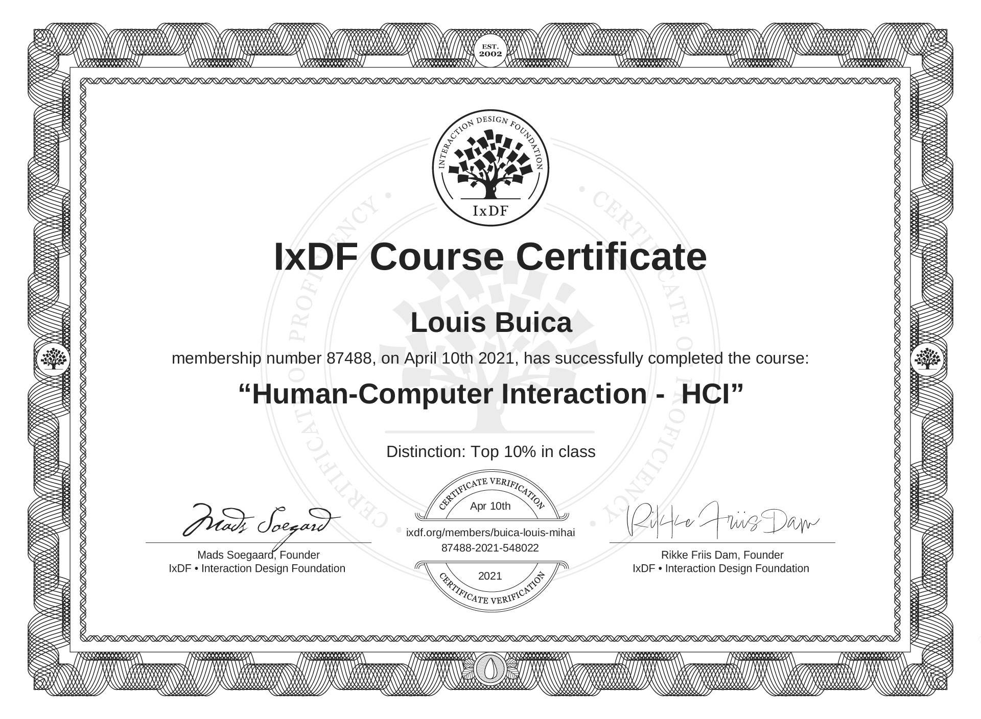The IxDF Course Certificate above is awarded to Louis Buica with a Top 10% Distinction in formal recognition of their coursework surpassing the rigorous benchmarks of exceptional performance established by the IxDF Educational Codex.