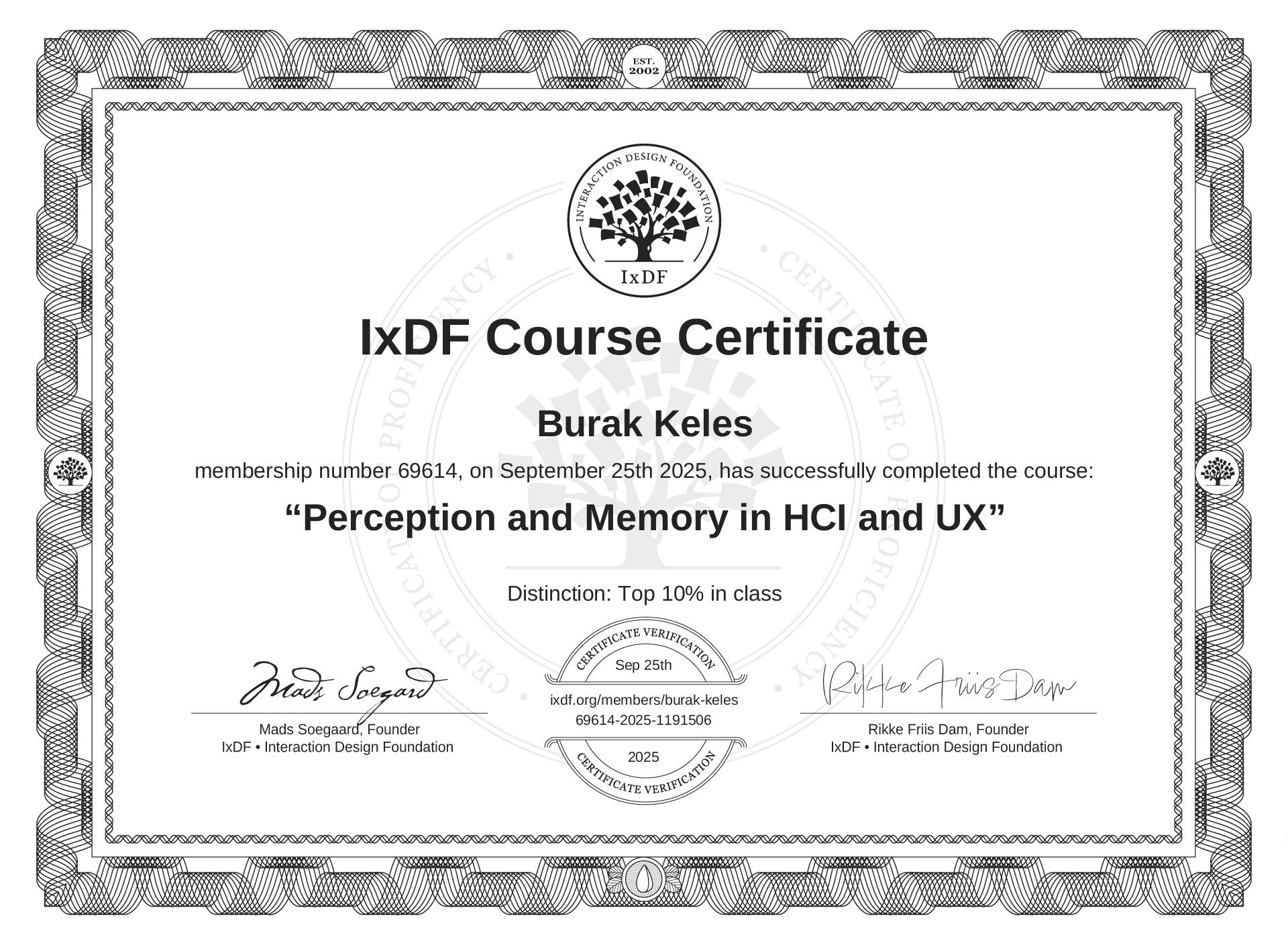 Burak Keles's IxDF Course Certificate: Perception and Memory in HCI and UX