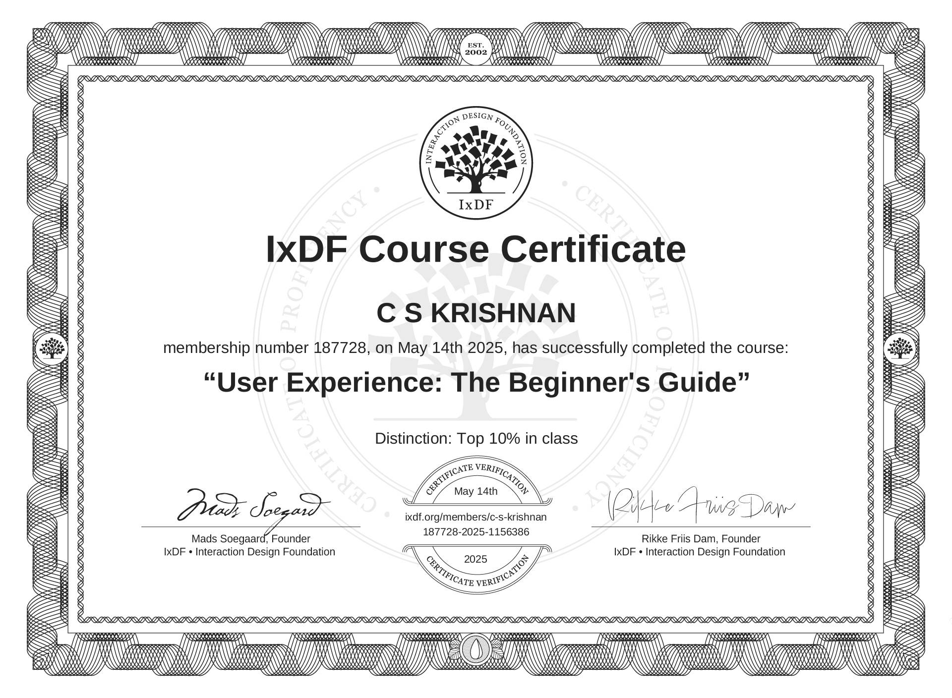 The IxDF Course Certificate above is awarded to C S KRISHNAN with a Top 10% Distinction in formal recognition of their coursework surpassing the rigorous benchmarks of exceptional performance established by the IxDF Educational Codex.