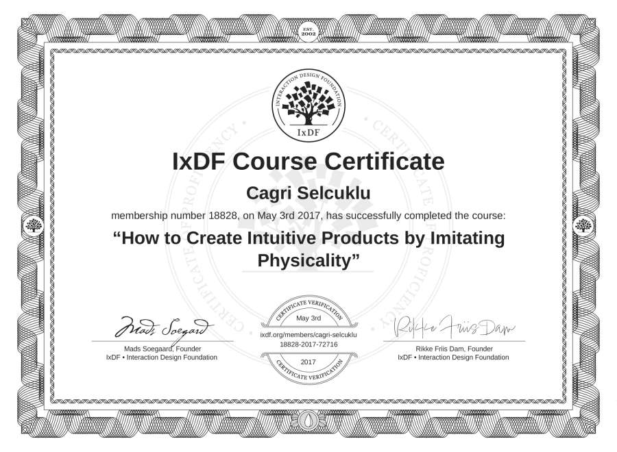 Cagri Selcuklu's IxDF Course Certificate: How to Create Intuitive Products by Imitating Physicality