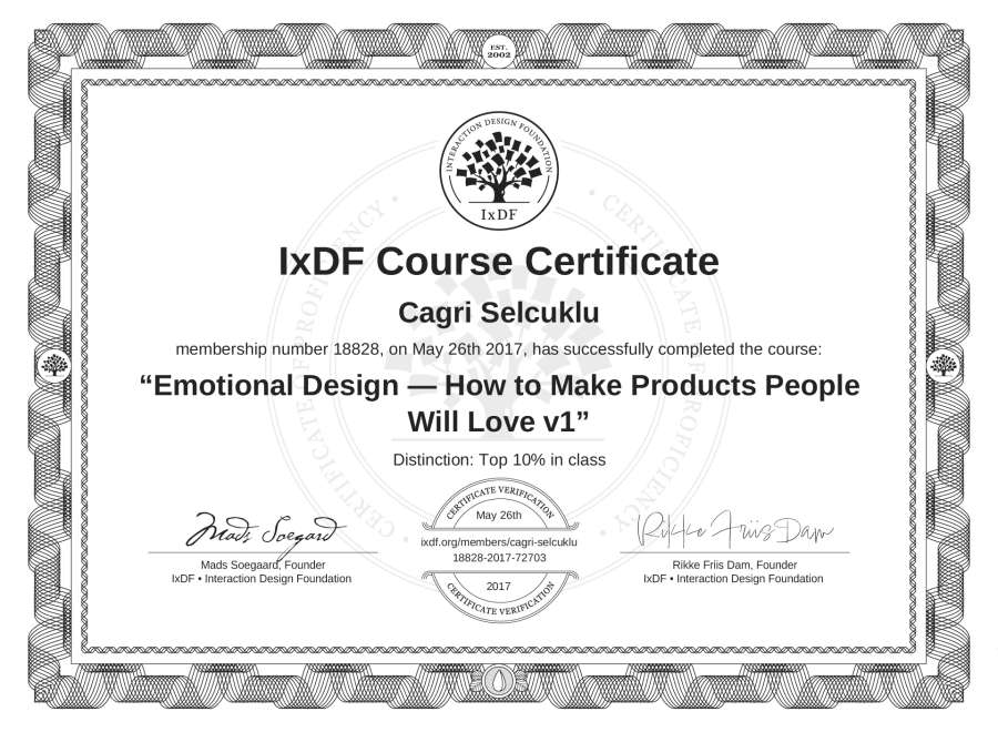 Cagri Selcuklu's IxDF Course Certificate: Emotional Design — How to Make Products People Will Love v1