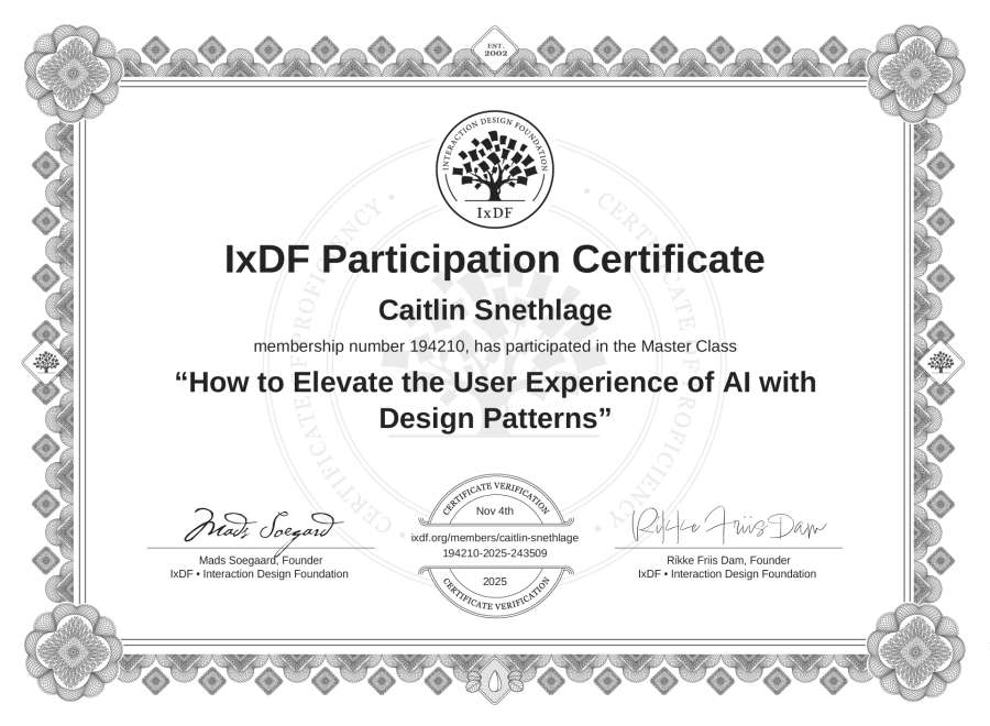 Caitlin Snethlage's IxDF Masterclass Certificate: How to Elevate the User Experience of AI with Design Patterns