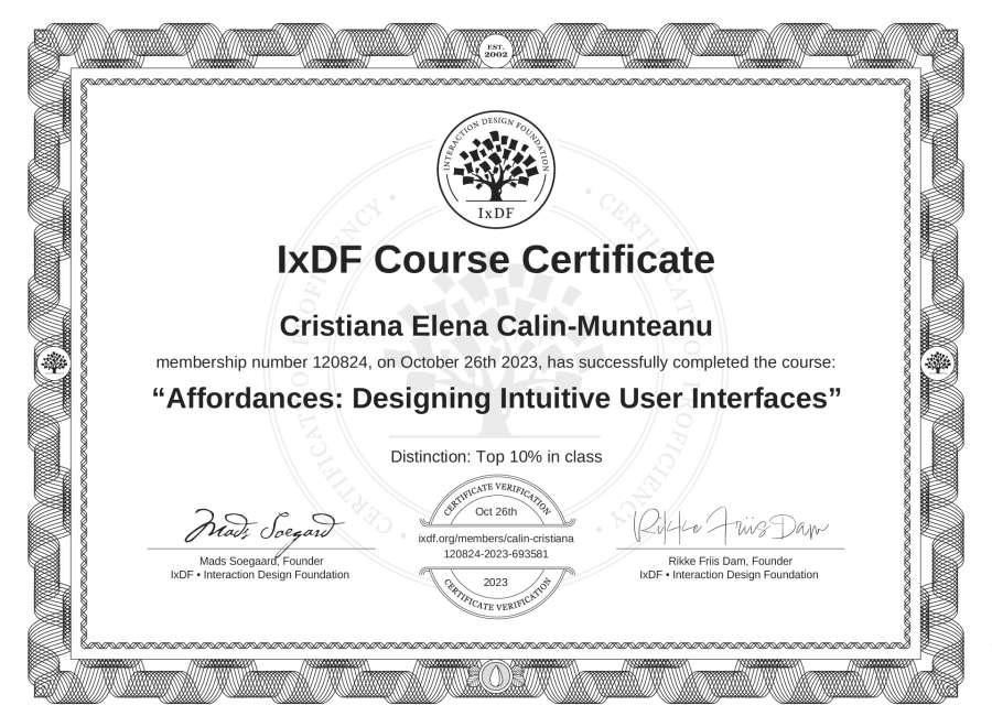 Cristiana Elena Calin-Munteanu's IxDF Course Certificate: Affordances: Designing Intuitive User Interfaces