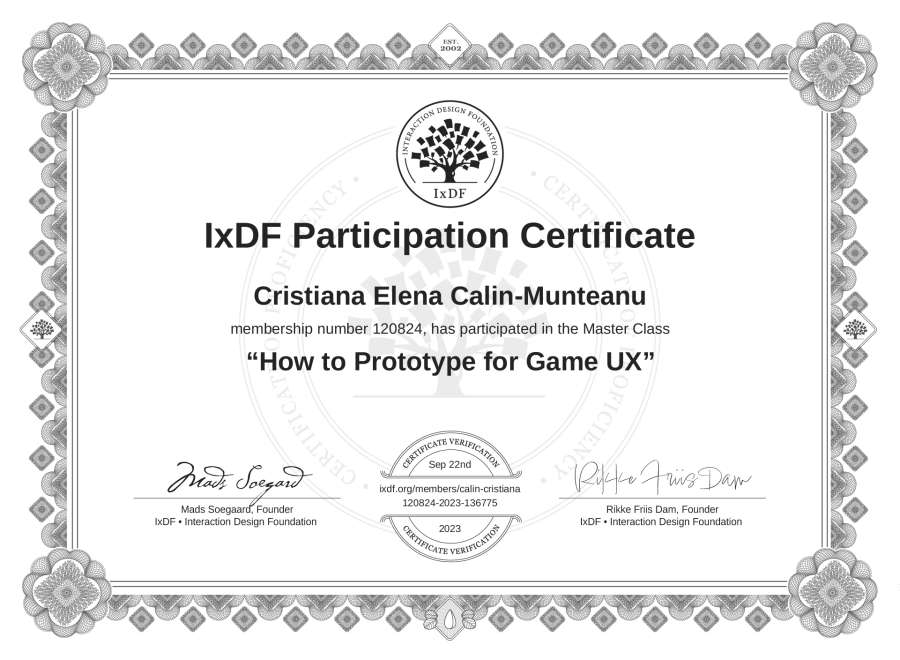 Cristiana Elena Calin-Munteanu's IxDF Masterclass Certificate: How to Prototype for Game UX