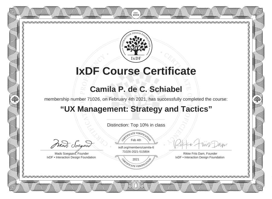 Camila P. de C. Schiabel's IxDF Course Certificate: UX Management: Strategy and Tactics