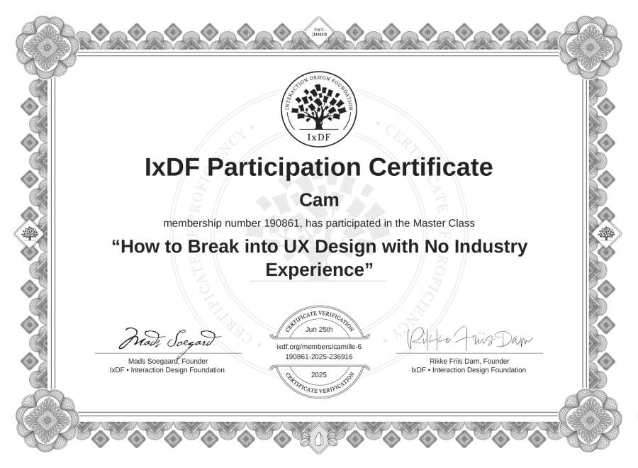 Cam's IxDF Masterclass Certificate: How to Break into UX Design with No Industry Experience