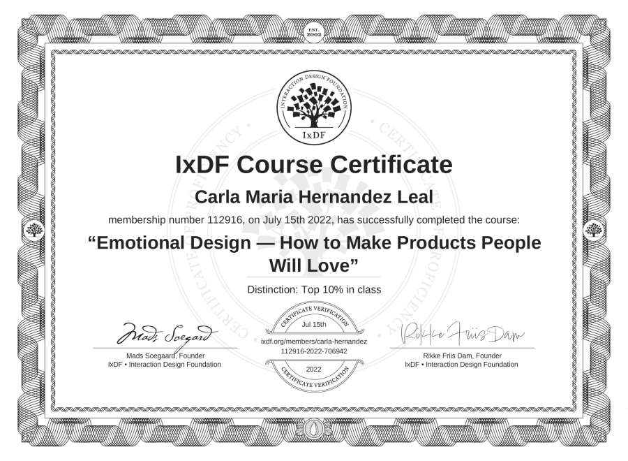 Carla María Hernández Leal's IxDF Course Certificate: Emotional Design — How to Make Products People Will Love