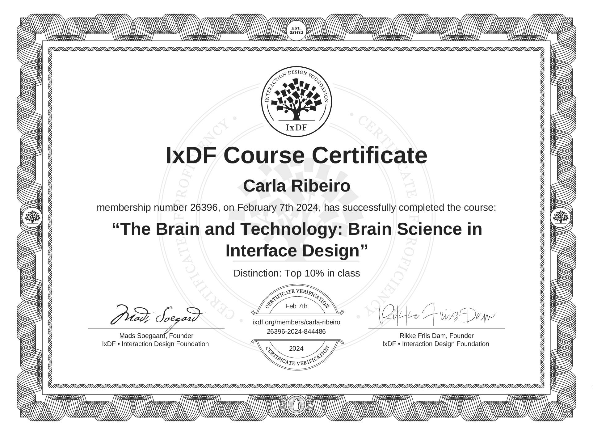 Carla Ribeiro's IxDF Course Certificate: The Brain and Technology: Brain Science in Interface Design